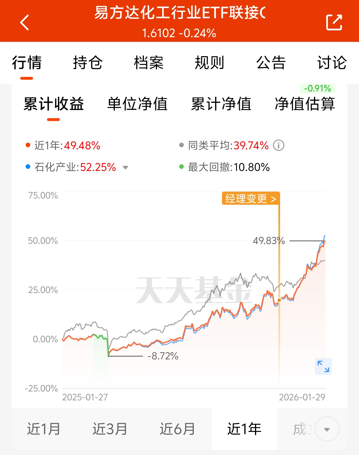今天国际金价大幅震荡调整,有色资源类今天走也是很难看。在反内卷行业中,有色已经走了一大波行情,目前调整一下无口厚非。我们可以关注一下化工领域,目前已有抬头之势,有望成为有色资源之后的强势赛道。$易方达化工行业ETF联接C$ 近一年涨幅49.48%,其主要聚焦化工行业,石油石化龙头+基础化工产业龙头,其持仓都是化工业的优质龙头,更能体现出布局化工业的价值,行情震荡。可以分批布局