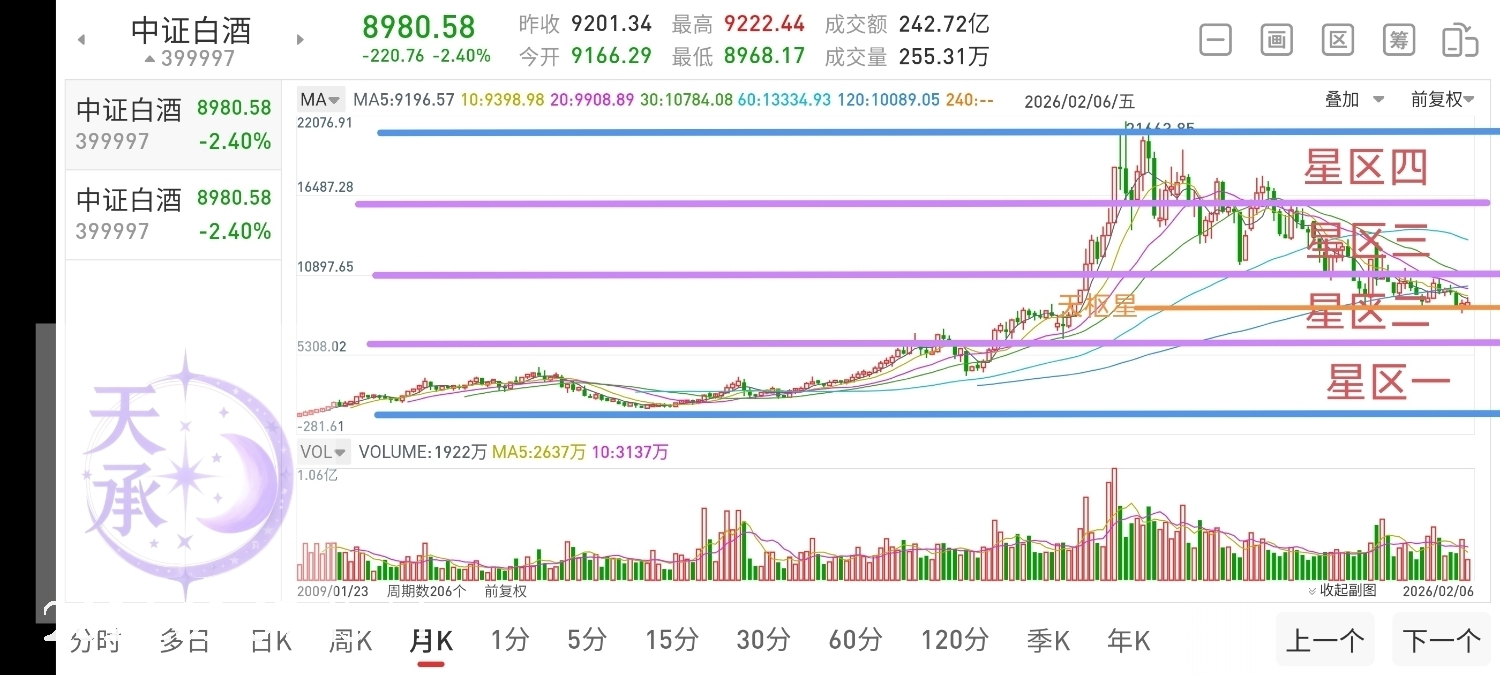 3.把基金中长线上攻趋势段用三月刃划分四等分,从下到上得出4个星区。如图(以中证白酒为例)。回调至星区二的一半之下,可开始考虑分批布局(若处于星区一低风险区域为最好)。