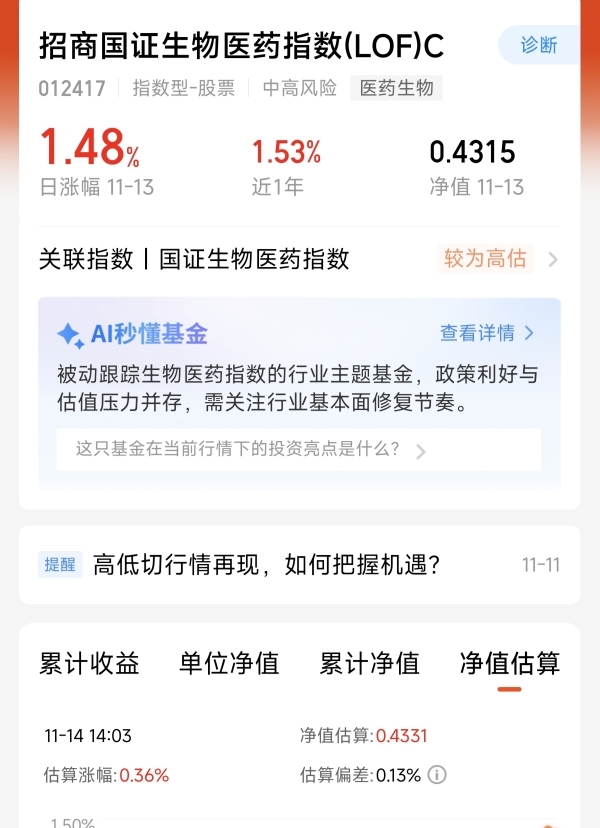 $招商国证生物医药指数(LOF)C$ 这是聚焦生物医药产业的指数基金。紧密跟踪国证生物医药指数。全面覆盖国内优质生物医药企业。长期来的表现一直不错。今天的估值又上涨了0.36%。昨天也上涨了1.48%。都是跑赢同类指数基金。而且遇到波动,稳定性一直也是不错。目前的医药整体估值低。修复的空间比较大。我看好基金长期的稳定表现。