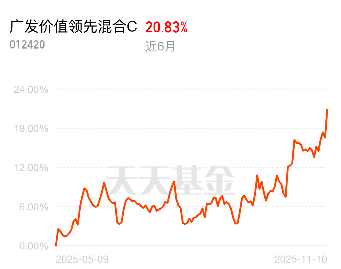$广发价值领先混合C$ 优秀了,今天大盘跌的,刚看到这只,居然还涨超3%,持仓中有一些航空板块和旅游相关,带消费属性,正好是今天消费领涨的方向之一,加了自选,看明天有没有机会进。