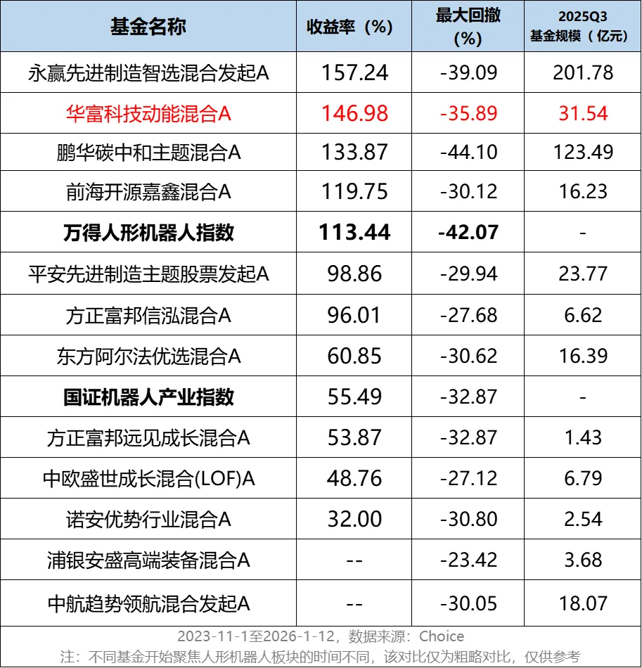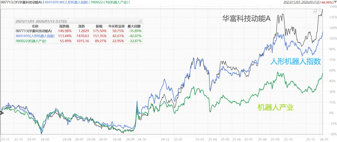 2023年四季度,华富科技动能完成改造,沈成很快又展现出了优秀的超额收益能力,2年多来跑赢了人形机器人指数约33%,并创新高,其中2025年实现了108.28%的翻倍涨幅。(2023-11-1至2026-01-12数据来源:Wind)