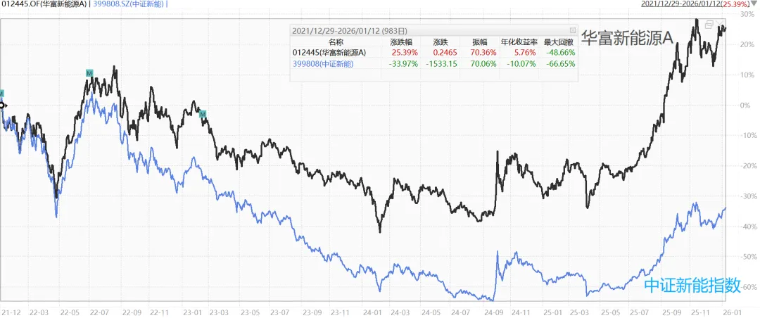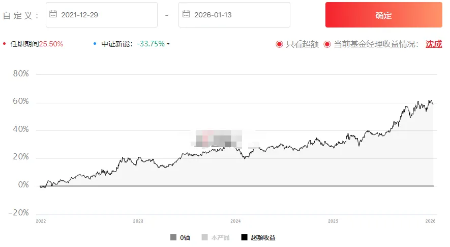 沈成管理的第一只基金是华富新能源,2021-12-29任职以来大幅跑赢了中证新能约59%,近期还创了新高,下图是任职以来基金走势对比中证新能。(数据来源:wind,2021-12-29至2026-1-13)