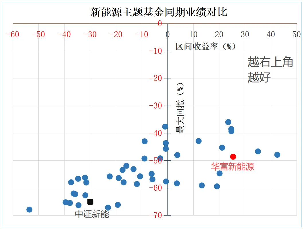 风险控制方面,管理华富新能源以来最大回撤-48.66%,同期中证新能最大回撤为-66.65%。