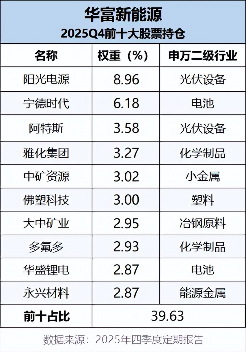 下表为华富新能源最新公布的前十大持仓,四季度他提升了对锂电中游材料、上游资源及光伏板块的配置。