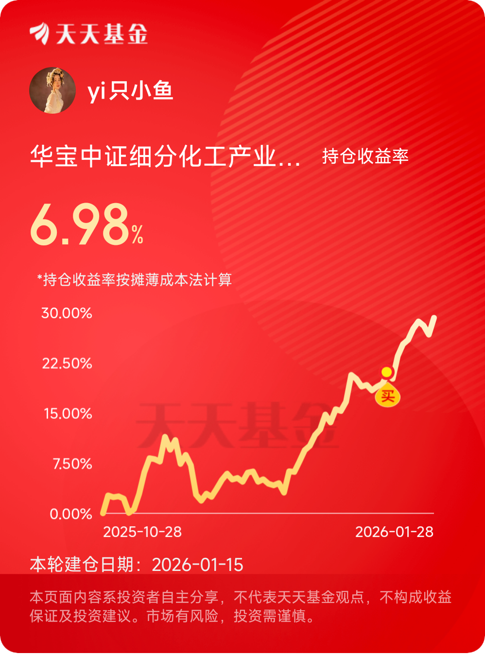 我的$华宝中证细分化工产业主题ETF联接C$ 今天更新净值上涨1.98%,继续吃肉咯。并且随着下游需求复苏,行业基本面转暖,板块未来走势依旧可期,还是要继续拿稳手中筹码。#晒收益#