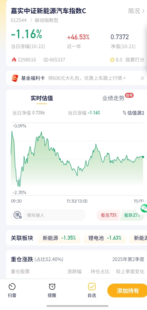 【嘉实中证新能源汽车指数C基金估值播报+当日行情】