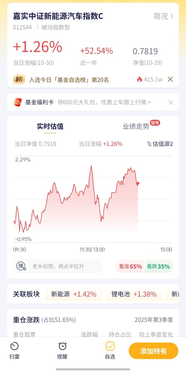 嘉实中证新能源汽车指数C今日预估涨幅1.26%!新能源汽车板块表现活跃,该基金领涨自选,表现出色。