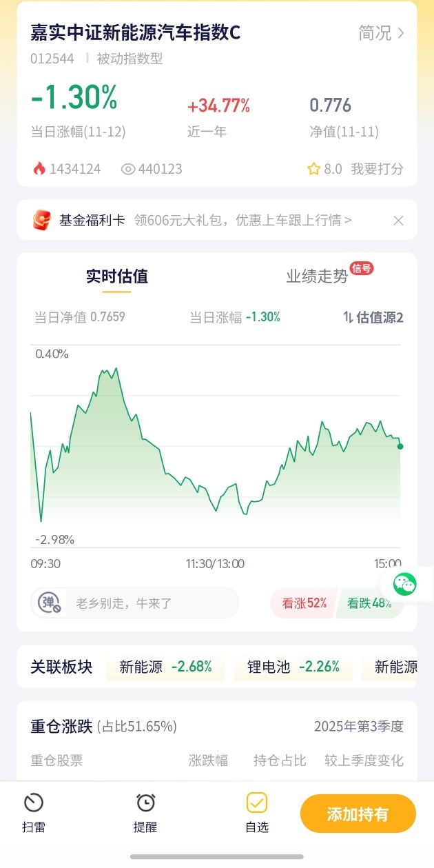 嘉实中证新能源汽车指数C今日预估涨幅-1.30%!新能源汽车板块小幅调整,该基金领跌自选,需关注