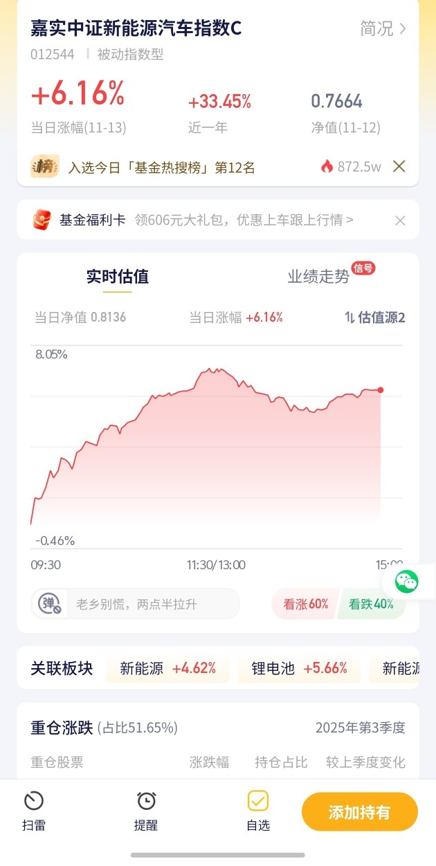 嘉实中证新能源汽车指数C今日预估涨幅6.15%!新能源汽车赛道回暖,这只基金的涨幅在自选里很突出,值得关注
