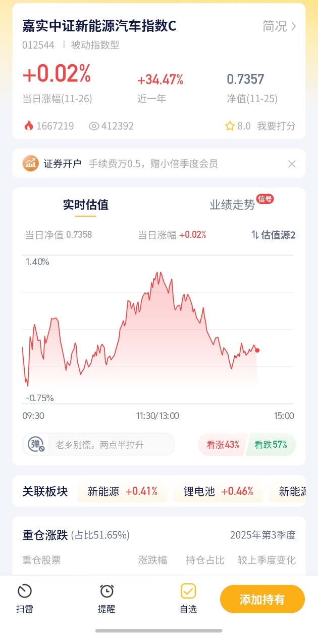 嘉实中证新能源汽车指数C今日预估涨幅0.03%!新能源汽车板块小幅波动,这只基金还是稳住了红盘