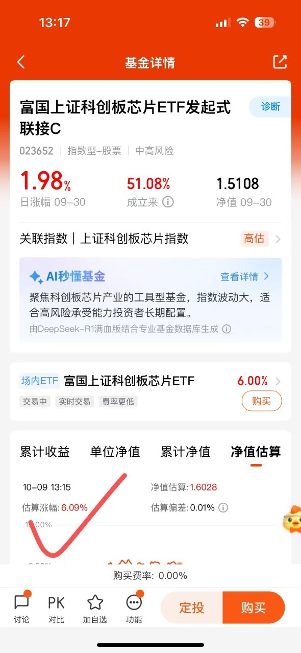 科技行情火爆,带动芯片板块涨起来,今天跟上$富国上证科创板芯片ETF发起式联接C$ 盘中估值6.09%,是个补仓的好时机