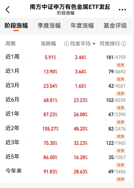 今天又买了点$南方中证申万有色金属ETF发起联接A$(004432)。有色板块在市场反弹中经常表现不错,这次看来也不例外。整个板块指数今年以来涨幅高达80%,这个强度值得留意。我持有的这只基金抓住了行情,今年以来的涨幅达到了91%,业绩非常亮眼。目前的环境下,金属的供需关系在一些领域存在缺口,同时宏观经济的周期性修复也在进行,这为板块提供了一定的基本面支撑。该基金近六个月上涨了68%,近三个月上涨22%,走势比较强劲。基于这些观察,我认为现在是可以考虑这个方向的时候,对未来的表现可以抱有积极的看法。#【跨年坦白局】提问金梓才、陈果#