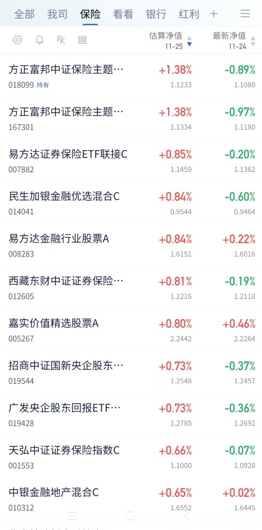 今天大涨太开心了!综合看下来,保险板块既有短期大涨的行情,又有长期基本面支撑,还有三万亿险资、低估值这些利好,不管是想短期捞一笔,还是长期持有,保险都是不错的选择,持续看好,要选就选个最猛的!!!$东财证券保险A$ 上涨0.95%,$国富金融地产混合A$ $方正富邦中证保险C$ 预估上涨1.98%。