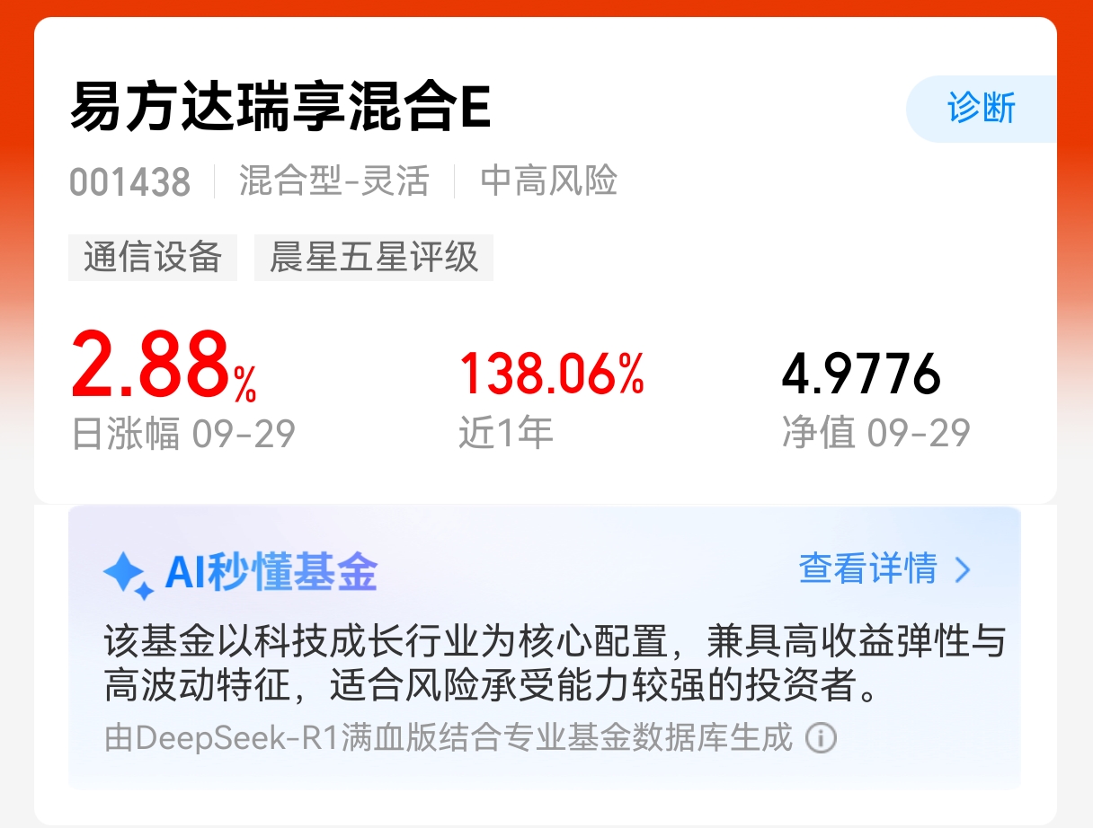 专业的事情还是要交流专业的人来做,这个业绩太强了,$易方达瑞享混合E(OTCFUND|001438)$近三个月涨幅65.56%,近六个月涨幅113.58%,近一年涨幅138.06%,这时候调整就是加仓机会,基金经理前瞻能力强,成立来10年里紧密把控成长机会,长期走势强、在成长行情下爆发力强,比竞品涨得好。