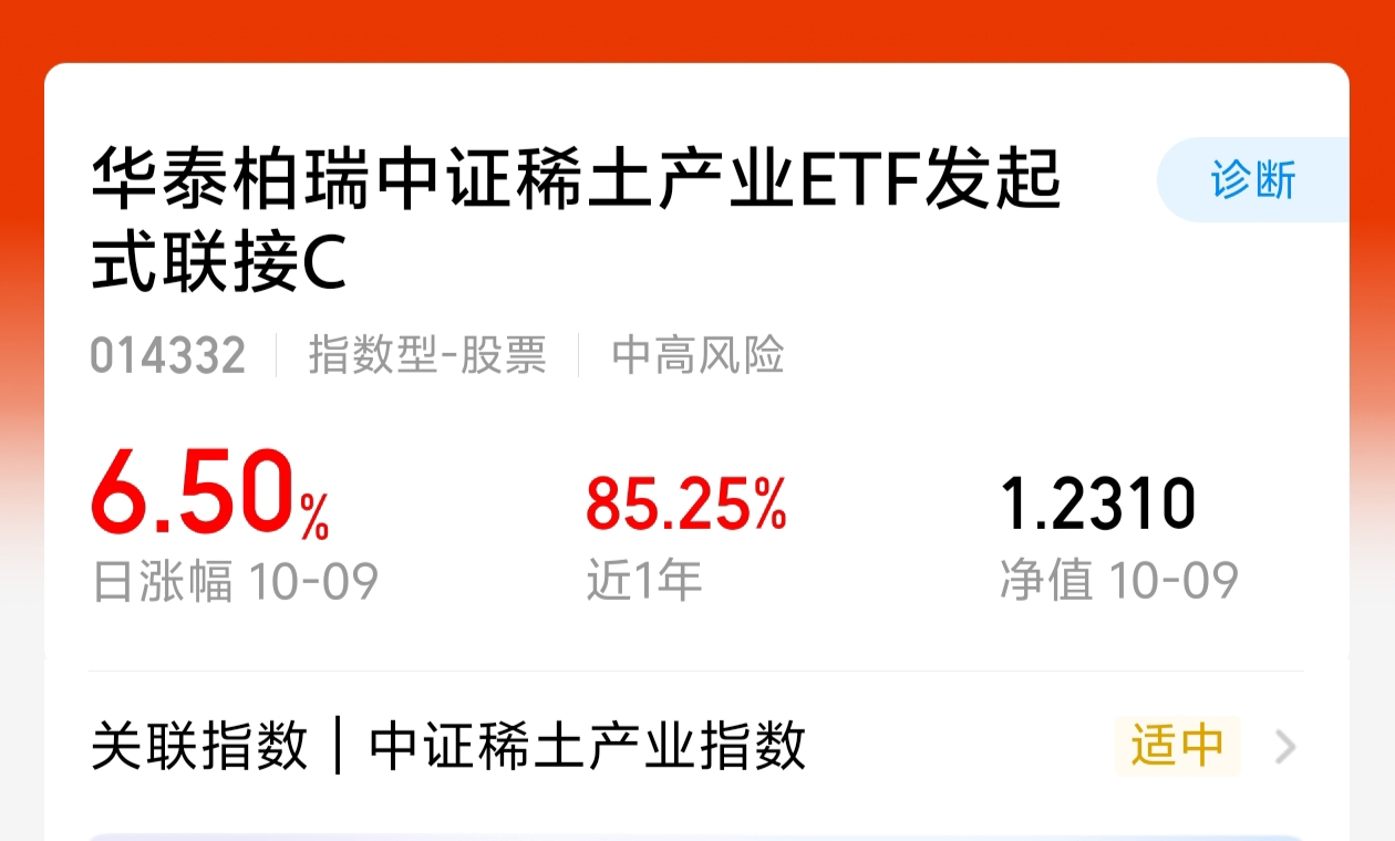 $华泰柏瑞中证稀土产业ETF发起式联接C$ 今天大涨6.5%!近一年累计涨幅85.25%,太猛了。中国强化稀土产业链主导地位,这些龙头企业直接受益,未来空间还很大啊。
