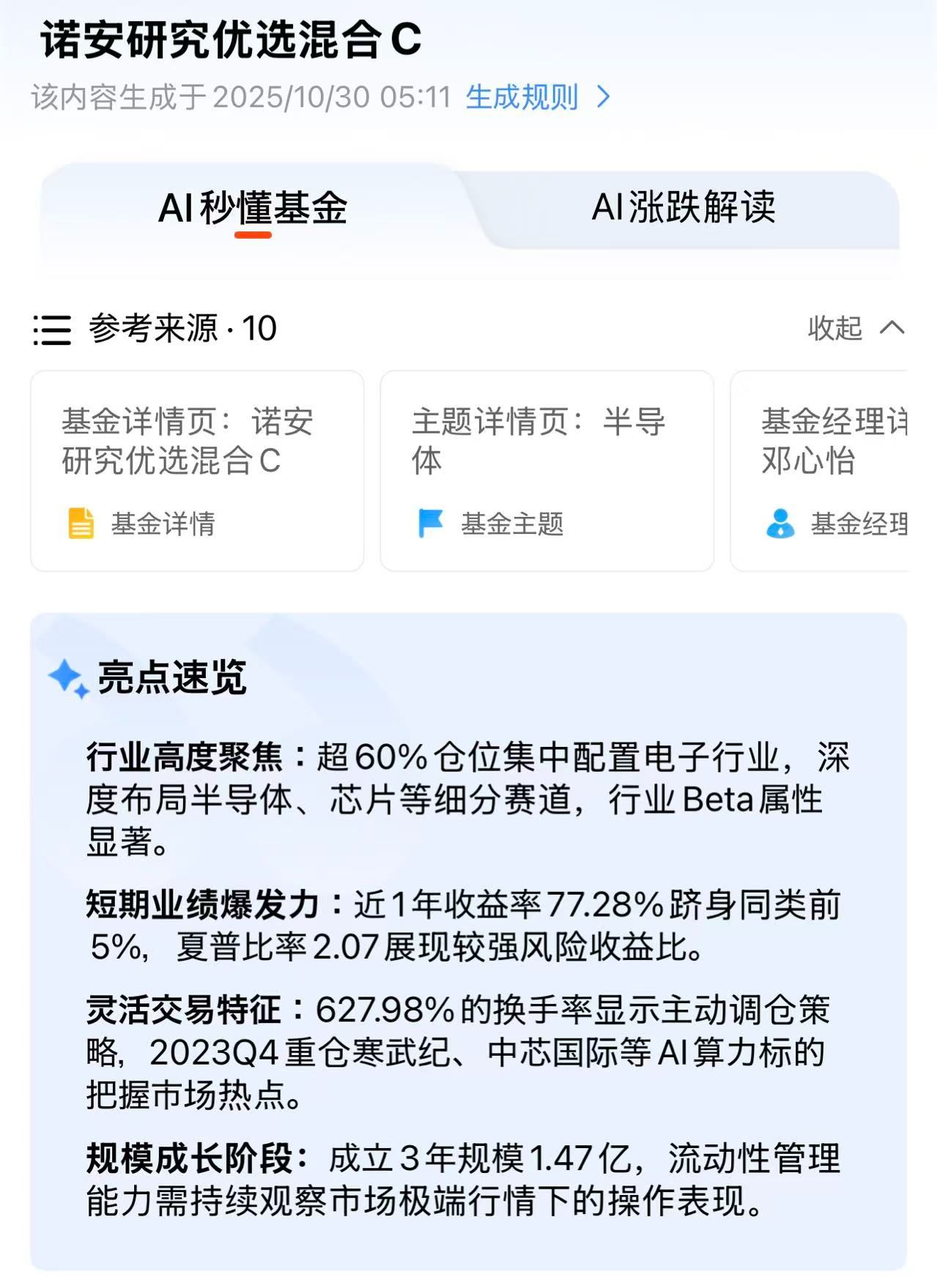 今天算是看明白了,监管层查伪科技股,那些没业绩的全跌崩了,半导体板块一片狼藉,诺安研究优选混合C(014497)却涨0.71%,成了唯一红盘。它持仓的企业要么有大基金加持,要么刚拿到融资,都是有真东西的,这种才抗跌。#飞天茅台批发价跌破1700!酒价何时触底?#