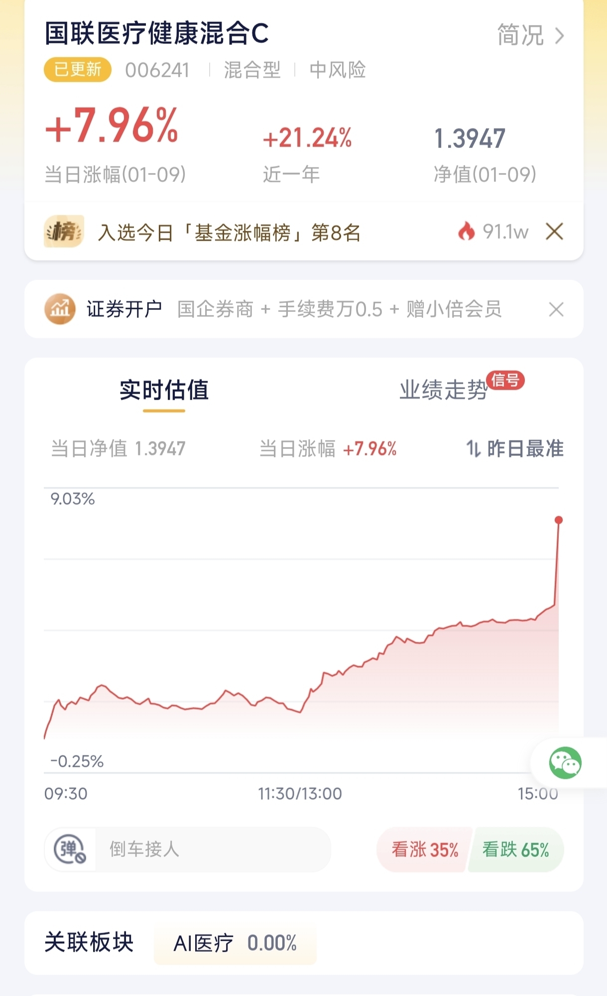 今儿打开行情软件,AI医疗板块直接逆势上涨,太亮眼了!这行情真不是偶然,现在大家对医疗健康越来越重视,AI能解决医疗资源分布不均的问题,让更多人方便看病,需求端特别扎实。而且创新药的研发成果不断落地,脑机接口也迎来政策红利,这几个方向都是未来的黄金赛道,中长期肯定有大机会。国联已经三连涨,净值持续走高,说明资金早就盯上这个领域了。咱们自己选股容易踩雷,不如选个专业的基金帮着打理,华泰柏瑞就很不错,聚焦医疗健康核心赛道,把创新药、AI医疗、脑机接口都涵盖了,风险控制也做得好。现在正是布局的好时机,趁着行情刚启动,慢慢进场,跟着赛道一起成长多香啊!