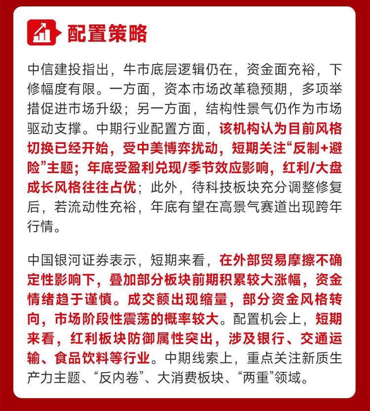 中国银河证券表示,短期来看,在外部贸易摩擦不确定性影响下,叠加部分板块前期积累较大涨幅,资金情绪趋于谨慎。成交额出现缩量,部分资金风格转向,市场阶段性震荡的概率较大。配置机会上,短期来看,红利板块防御属性突出,涉及银行、交通运输、食品饮料等行业。中期线索上,重点关注新质生产力主题、“反内卷”、大消费板块、“两重”领域。