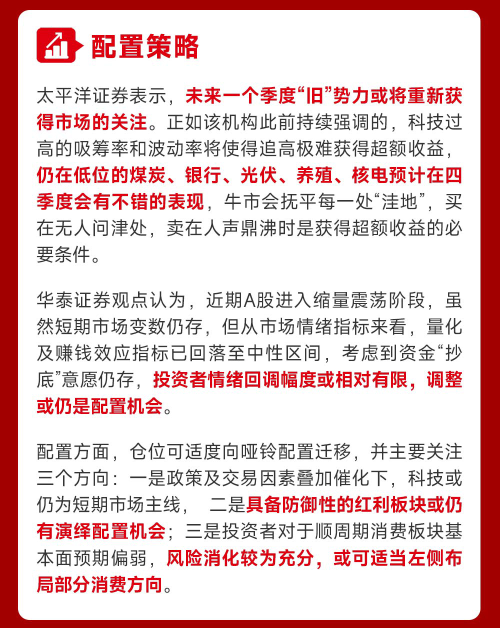 太平洋证券表示,未来一个季度“旧”势力或将重新获得市场的关注。正如该机构此前持续强调的,科技过高的吸筹率和波动率将使得追高极难获得超额收益,仍在低位的煤炭、银行、光伏、养殖、核电预计在四季度会有不错的表现,牛市会抚平每一处“洼地”,买在无人问津处,卖在人声鼎沸时是获得超额收益的必要条件。