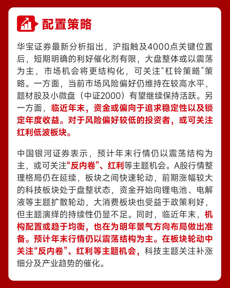 华宝证券最新分析指出,沪指触及4000点关键位置后,短期明确的利好催化剂有限,大盘整体或以震荡为主,市场机会将更结构化,可关注“杠铃策略”策略。一方面,当前市场风险偏好仍维持在较高水平,题材股及小微盘(中证2000)有望继续保持活跃。另一方面,临近年末,资金或偏向于追求稳定性以及锁定年度收益。对于风险偏好较低的投资者,或可关注红利低波板块。