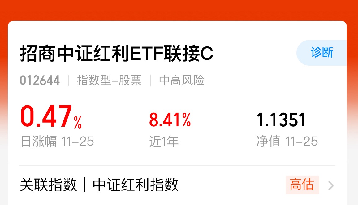 近期行情波动红利类的板块虽然没有涨很多,但是在年关来临越发受到重视这一个$招商中证红利ETF联接C$ 主打银行,煤炭等低估值高股息板块近5%的股息率凸显防御的价值,主要就是年末红利,资产资金考核周期带来的季节效应,主要特征是风险偏好,从进攻到防守的切换,10月往12月份过渡阶段低估值的板块更为受到资金的关注