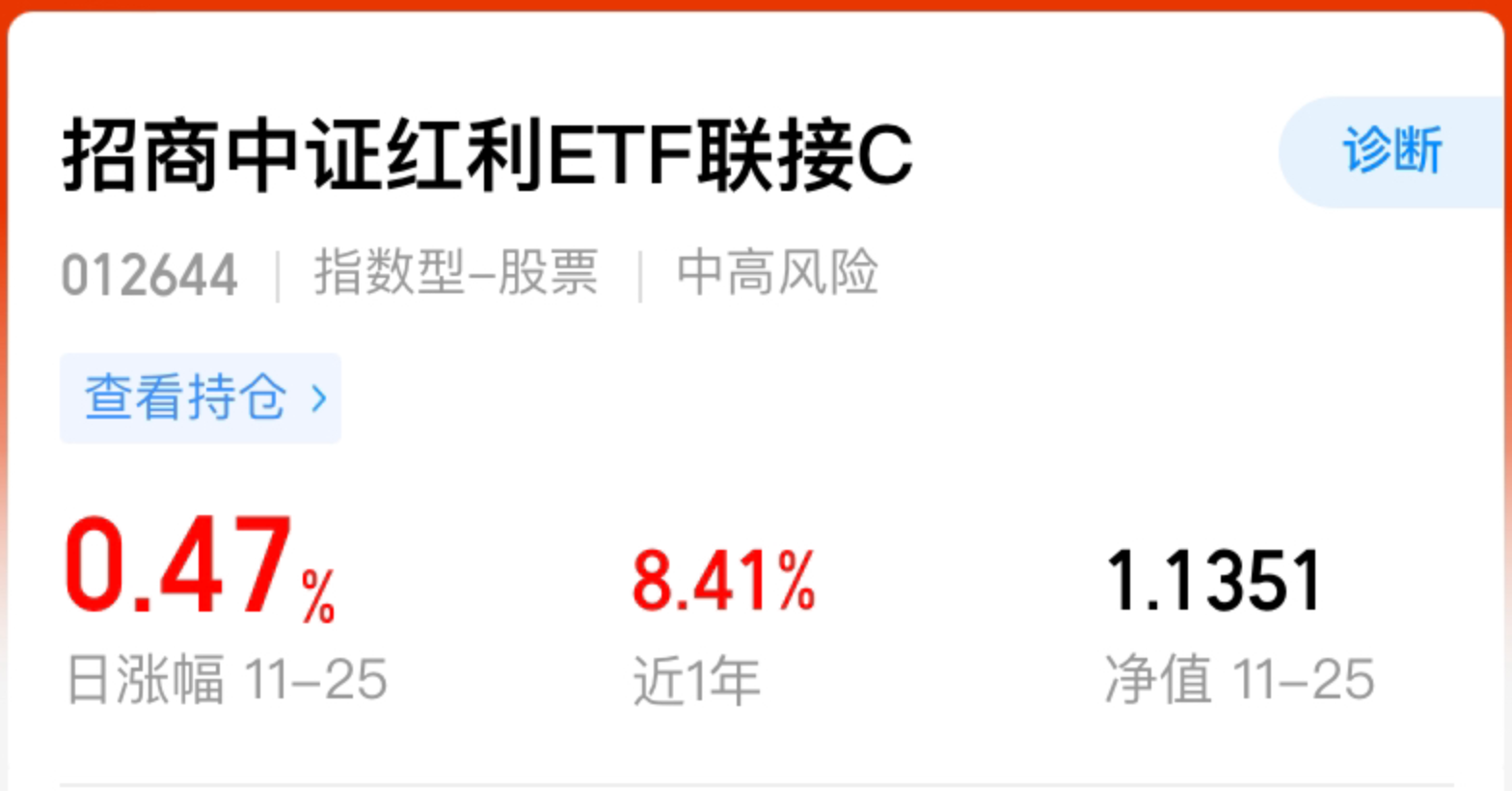 $招商中证红利ETF联接C(OTCFUND|012644)$覆盖稳健领域,抗跌费率低,我打算补仓,长期持有等收益。