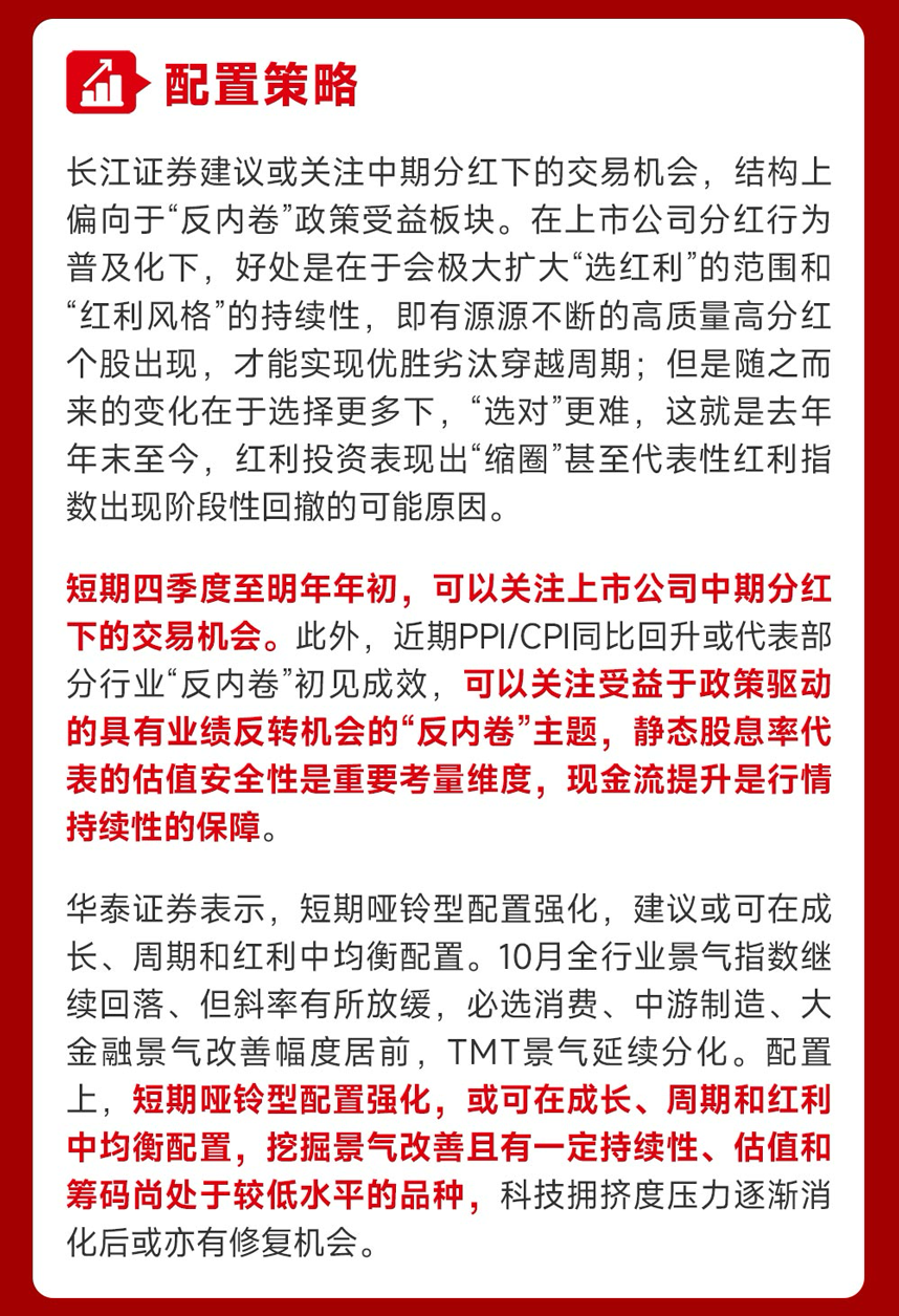 短期四季度至明年年初,可以关注上市公司中期分红下的交易机会。此外,近期PPI/CPI同比回升或代表部分行业“反内卷”初见成效,可以关注受益于政策驱动的具有业绩反转机会的“反内卷”主题,静态股息率代表的估值安全性是重要考量维度,现金流提升是行情持续性的保障。