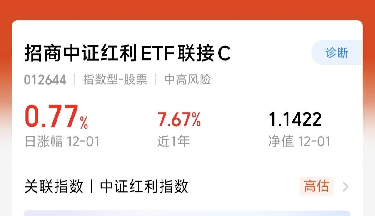 $招商中证红利ETF联接C$ 是聚焦红利的指数基金。紧密跟踪中证红利指数。持仓全部都是高股息,低波动的稳定资产。昨天上涨了0.77%。近一年上涨了7.67%。而且还有稳定的分红。期待四季度继续创新高。
