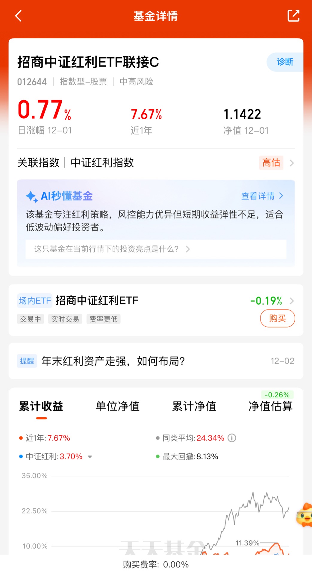 今日三大指数全面震荡调整,中证红利行情呈现低开震荡调整态势,$招商中证红利ETF联接C$ 目前微绿。