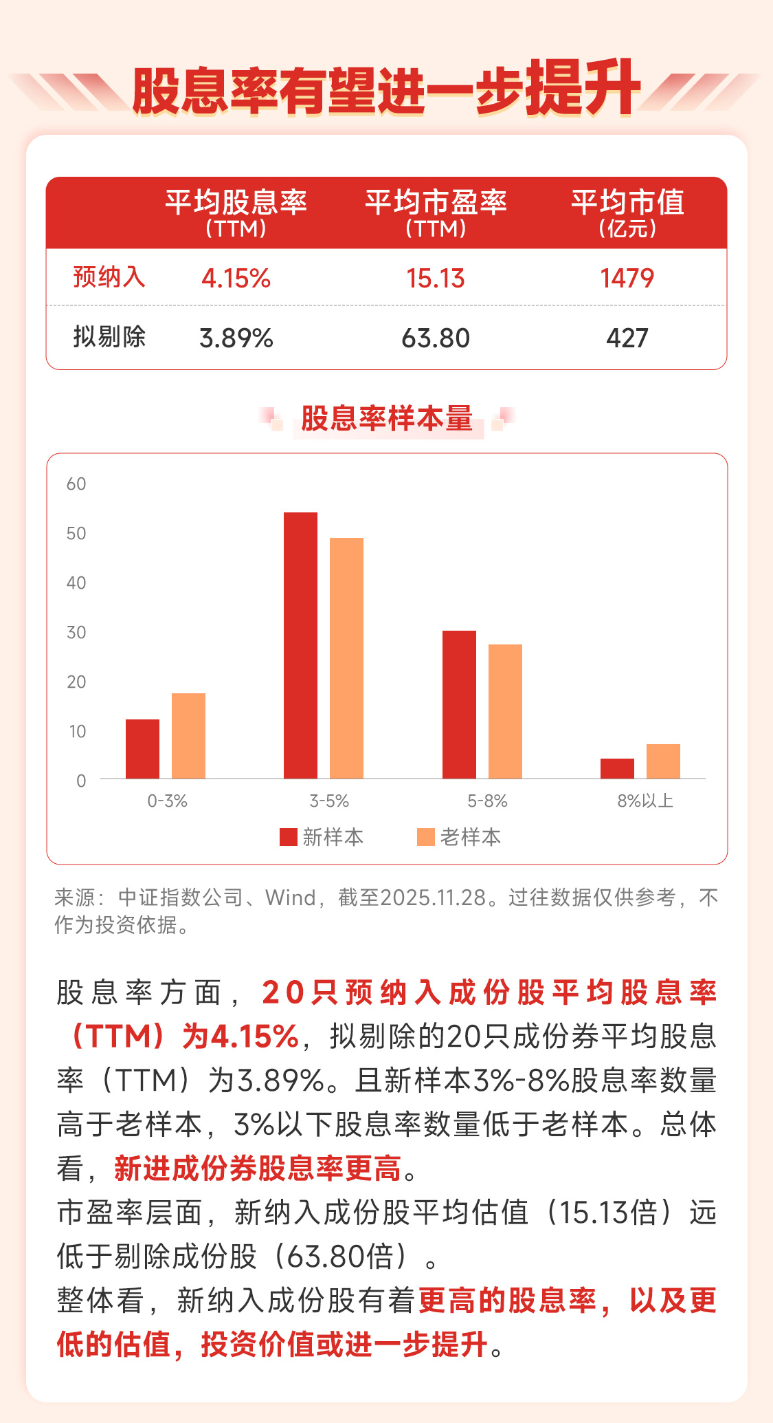 2⃣预纳入样本平均股息率(TTM)4.15%,估值也更低,指数投资价值或进一步提升。
