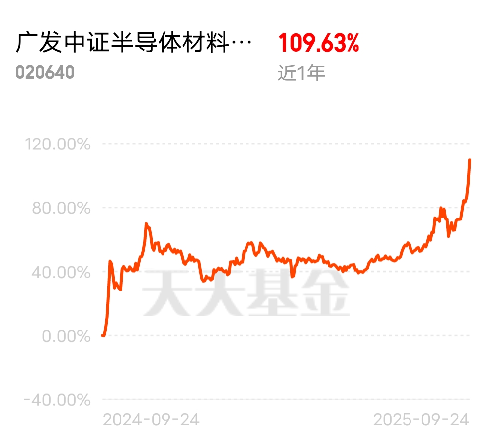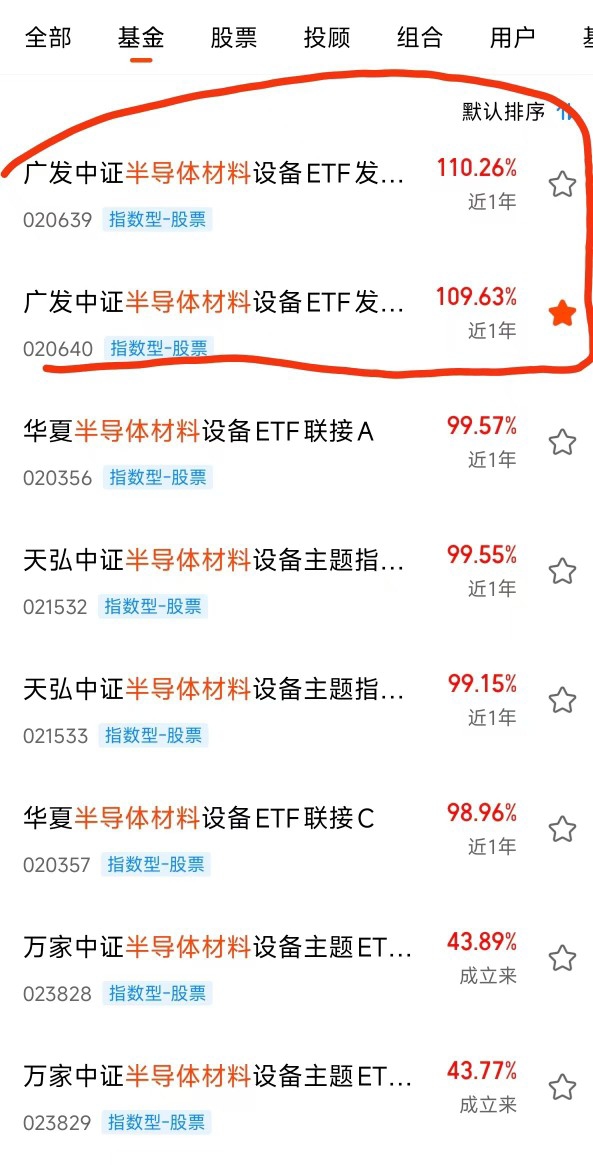 大基金三期重点就是投设备和材料,这是明牌。加上国产替代的紧迫性,设备板块景气度会很长。$广发中证半导体材料设备ETF发起式联接C$今天大涨7.64%,近一年涨幅也是109.63%,比其他同指数高了10%,算是提前反映了点预期,和$博时半导体主题混合C$ 拿住不动了