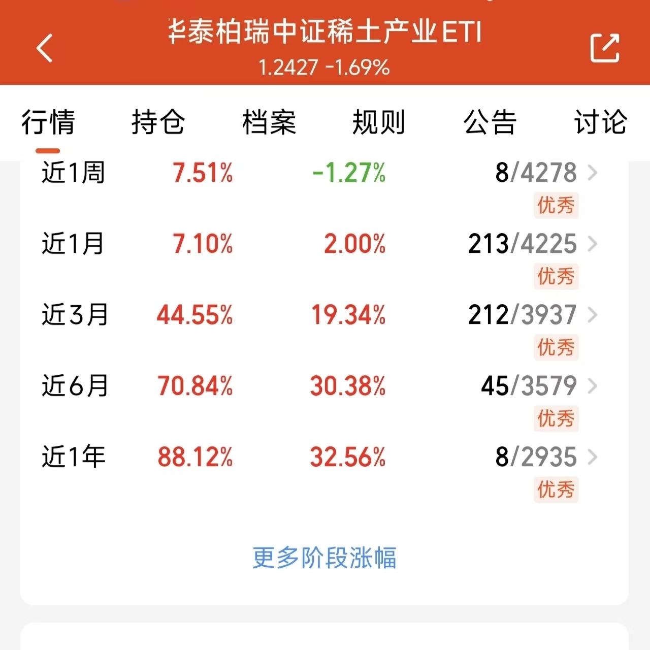 稀土这涨幅,$华泰柏瑞中证稀土产业ETF发起式联接C$ 近一年88.12%,近三个月44.55%。反制逻辑下板块确定性很强,回调要敢买。