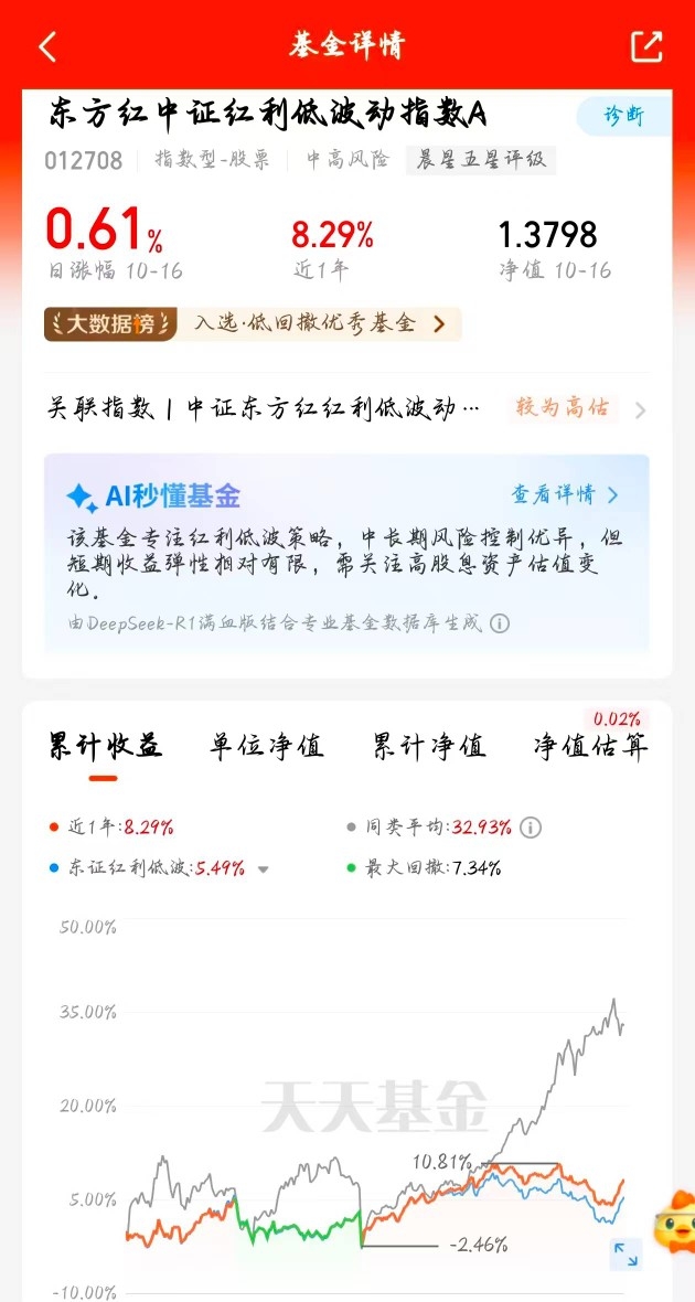 市场波动时我就庆幸拿了红利基金,东方红这款近一年7.85%回报,净值连续六天上涨,低波高股息才是底仓首选。