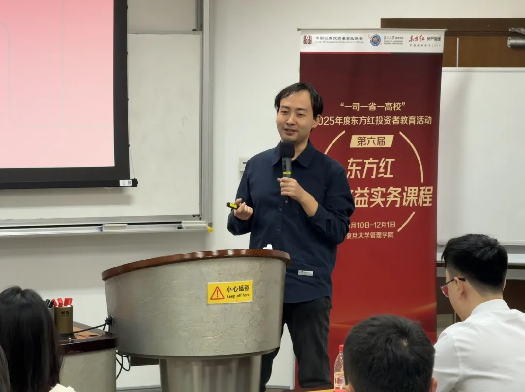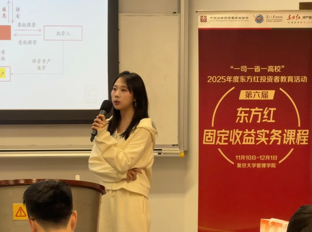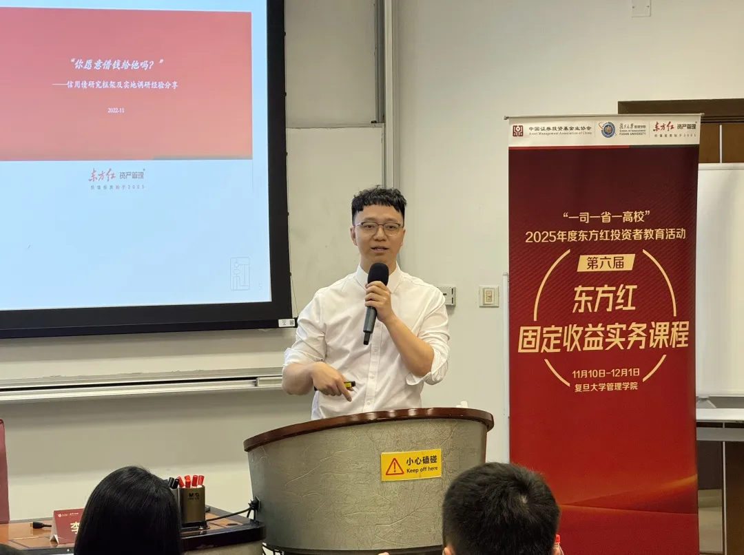 2025年11月17日,在中国证券投资基金业协会的指导下,东方红资产管理与复旦大学管理学院合作举办的第六届“东方红固定收益实务课程”迎来第二节课。本次课程由东方红资产管理公募固定收益投资部李林、混合资产投资部谢成、绝对收益投资部许望婷授课,三位授课讲师分别围绕信用债ETF市场、可转债投资逻辑与公募REITs市场展开深度分享,为同学们呈现了一场固收领域的多维思想盛宴。