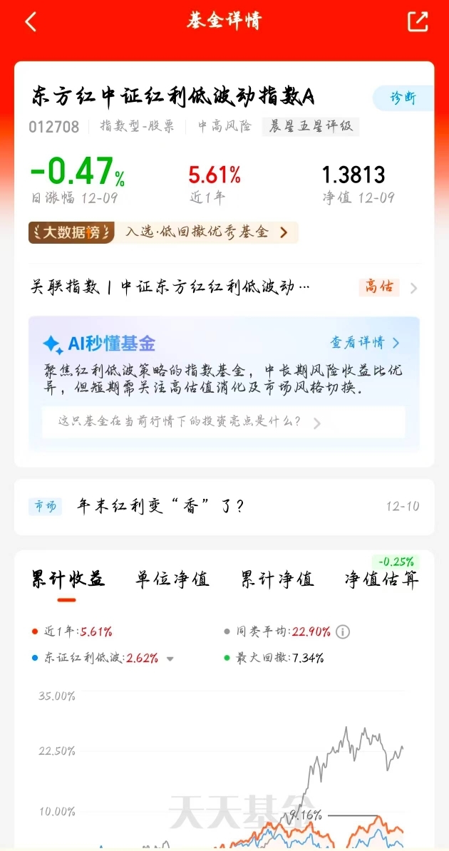 市场波动加大时,东方红中证红利低波动指数A作为唯一东证红利低波指基,近一年5.1
