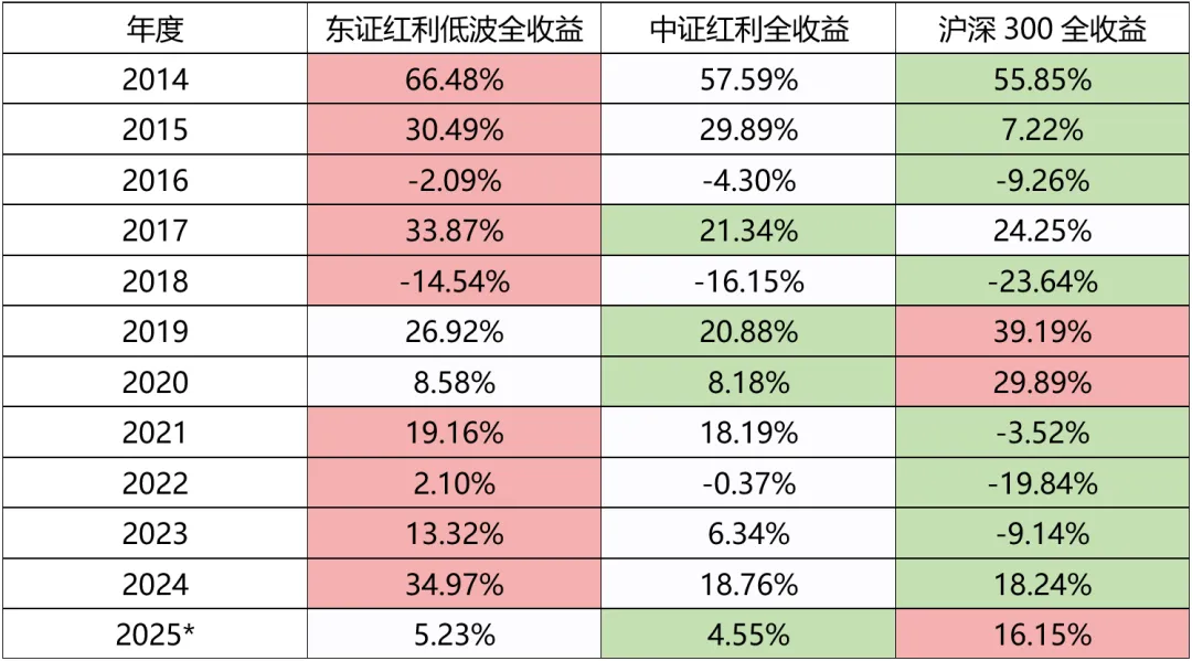 数据来源:Wind,其中2025年数据截至2025.11.21,东证红利低波全收益、沪深300全收益、中证500全收益指数代码分别为921446、H00300、H00905,同一年中,标红表示当年涨幅同比靠前,标绿表示当年涨幅同比靠后,指数数据仅供参考,不代表未来及本基金业绩表现。