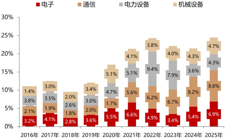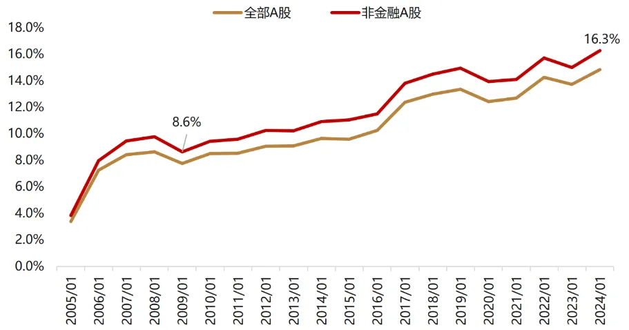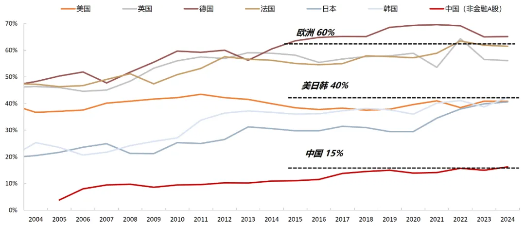 随着中国制造业深度嵌入全球价值链,A股盈利周期与国内经济周期相关性逐步减弱,非金融A股的海外营收占比已从2009年的8.6%提升至2024年的16.3%,A股海外收入系统性提升。其中,54%公司具备海外创收能力,这些公司的外销占比已达到23.3%。