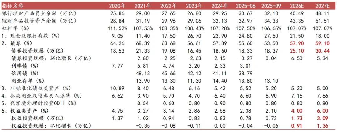 银行理财方面,权益资产配置比例有望上升。适度增配权益资产是破解理财收益困境的有效路径。截至三季度,权益类资产在理财持仓中的占比仅为2.10%,处于历史极低水平。若理财产品权益投资比例逐步提升至4%、6%,预计2026年、2027年可为权益市场带来约9051亿元、1.36万亿元的增量资金。