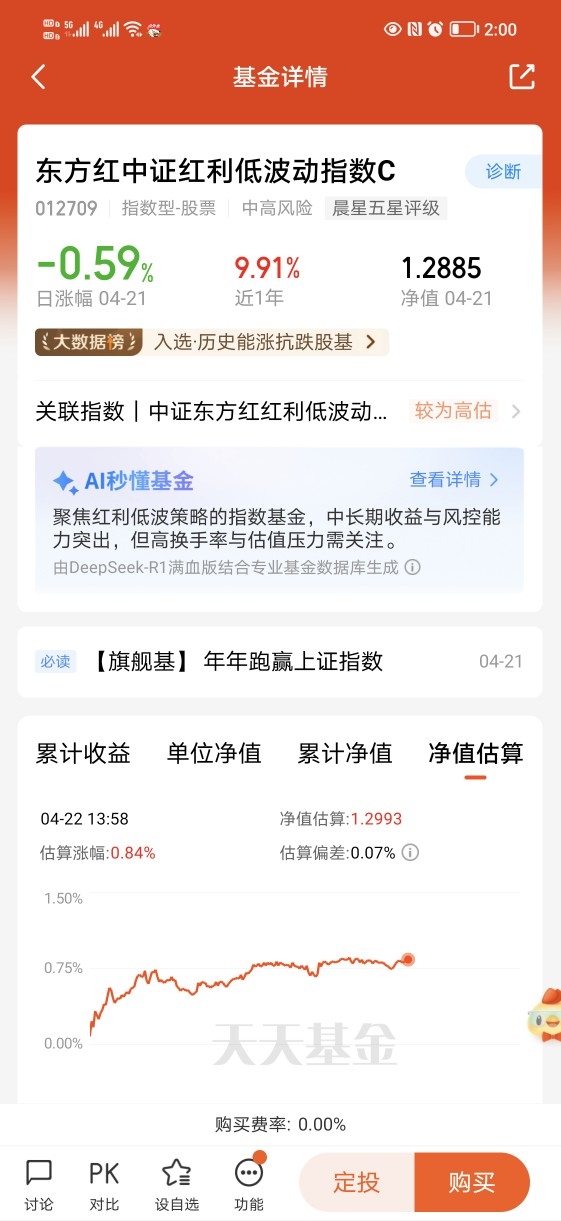 从过往业绩表现来看,$东方红中证红利低波动指数C$ (012709)近3年涨42.08%,近2年涨24.73%,近1年涨9.91%,中长期业绩稳定优秀,能够穿越牛熊稳定盈利。我认为这支基金很适合当前的市场环境,因此加入了自选,看好它接下来的表现。