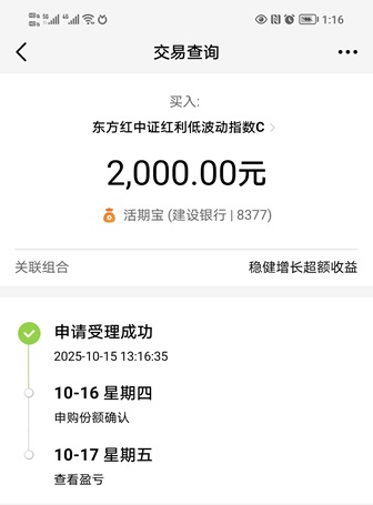 1.红利低波:我今天继续加仓$东方红中证红利低波动指数C(OTCFUND|012709)$2000元,它跟踪中证东方红红利低波动指数(931446)。该指数相较主流红利指数,低配煤炭、化工等周期性强的行业,更追求分红的稳定性。本指数波动更小,稳定盈利能力更强,红利属性更纯,是布局红利资产的理想工具。从技术面来看,指数自今年7月11日以来进入调整走势中,于今年9月26日探底回升,调整时间和空间都非常充分。进入十月以来,连续走出四根实体阳线,先后收复了5天10天20天30天和250天均线,转强信号明显。近期贸易博弈加剧,红利低波资产明显走强,叠加美再次降息预期上升,甚至称接下来有可能继续缩表,年内或仍有两次降息,对红利低波资产非常有利。本周科技成长题材快速回调,导致大盘连续大幅回撤。我相信主力不会任由这种行情持续,很可能会借道红利低波大盘权重股护盘,我决定加仓本基金适当防守一波。下面我晒一下买入操作记录: