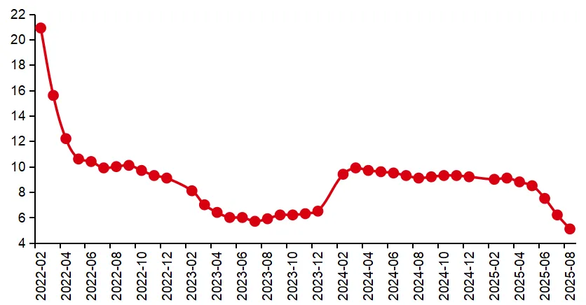 货币政策方面,美联储从9月开启的降息周期给了国内央行更大的货币政策操作空间,但央行也会有稳定银行净息差、减轻银行存款脱媒压力、避免股市波动率大幅上升等金融防风险考虑。9月央行开展6,000亿元6个月的买断式逆回购操作,全月买断式逆回购净投放3,000亿元,规模和8月持平,显示央行维持资金面相对宽松的态度未变。在地产量价仍有进一步的下行压力,中美贸易谈判前景仍存不确定性的情况下,预计2025Q4央行也会继续呵护资金面,保持流动性充裕。