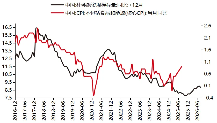 图:历史上核心CPI同比增速和领先1年的社融存量同比增速有较强的正相关性,但今年出现大幅分岔