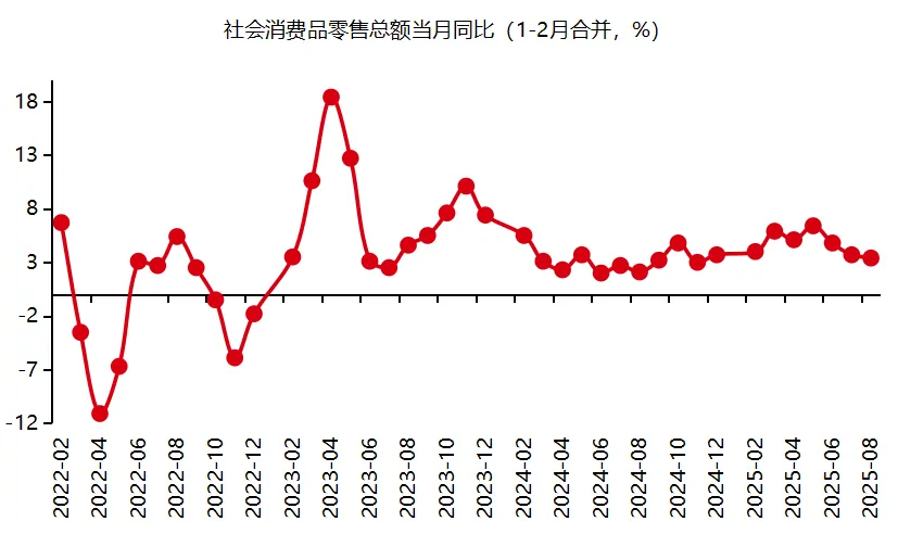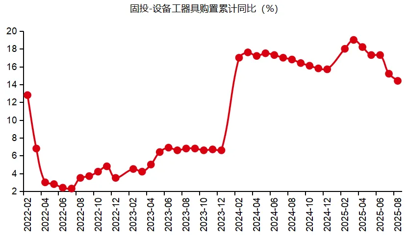 投资方面:1)制造业投资:2025年8月13日发改委宣布2025年超长期特别国债支持设备更新的1,880亿元投资补助资金已下达完毕,支持工业、用能设备、能源电力、交通运输、物流、环境基础设施、教育、文旅、医疗、住宅老旧电梯、电子信息、设施农业、粮油加工、安全生产、回收循环利用等领域约8,400个项目,带动总投资超过1万亿元,由于设备更新的落地速度较快,预计2025Q4设备更新投资将由于需求已前置释放而明显承压。由于2025年下半年以来政策层面以控量稳价的思路整治内卷式恶性竞争,严控产能过剩行业的新增产能是应有之义,加之纵深推进全国统一大市场建设的关键是统一政府行为尺度,杜绝地方政府为招商引资而进行财政补贴和税收优惠政策的内卷,这势必也会压制制造业投资。由于整体工业品价格的同比下滑在年内将持续,制造业企业利润和投资项目的ROIC都偏低,美国需求的恢复又具有不确定性,制造业企业自身也缺乏新建和扩建产能的意愿,因此年内制造业投资将持续承压。结构上,2025年1-8月消费品制造业投资累计同比增长9%,装备制造业投资累计同比增长3.2%,下游投资显著强于中游,由于政策层面整治内卷式恶性竞争主要针对中上游,且中上游价格表现相较下游更差,预计下游投资表现将持续强于中上游。2)地产投资:从作为领先指标的新开工面积看,后续地产建安投资同比降幅仍有扩大压力。2025年1-8月土地购置费累计同比下降10.2%,考虑到8月受重点城市优质地块出让节奏放缓影响,土地市场成交量价齐跌,平均溢价率为5.6%,为年内第二低,土地购置费后续将继续对地产投资形成拖累。3)基建投资:除了超长期特别国债和新增专项债资金加快落实到项目,类比2022年首批规模3,000亿元、最终追加至7,399亿元的撬动总投资9万多亿元的政策性开发性金融工具,5,000亿元的新型政策性金融工具有望在2025Q4对基建投资形成明显提振,其投向包括数字经济、人工智能、低空经济、消费基础设施、绿色低碳、农业农村、交通物流、市政园区等8大领域,20%必须投向民营企业,参考2022年政策性开发性金融工具对投资产生的12倍的撬动倍数,该5,000亿元的新型政策性金融工具可能撬动总投资6万亿元,即使由于地方政府的债务压力和优质项目供给有限等因素制约,实际撬动倍数未必有12倍这样高,但对1-8月仅累计同比增长2%的不含电力的基建投资而言,仍然意义重大。