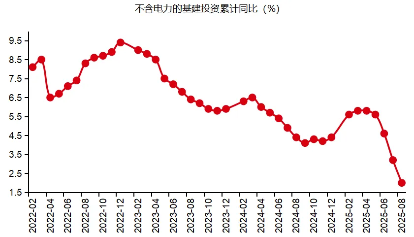 图:不含电力的基建投资累计同比增速自5月起即单边下行,1-8月仅为2%,而2024年同期高达4.4%