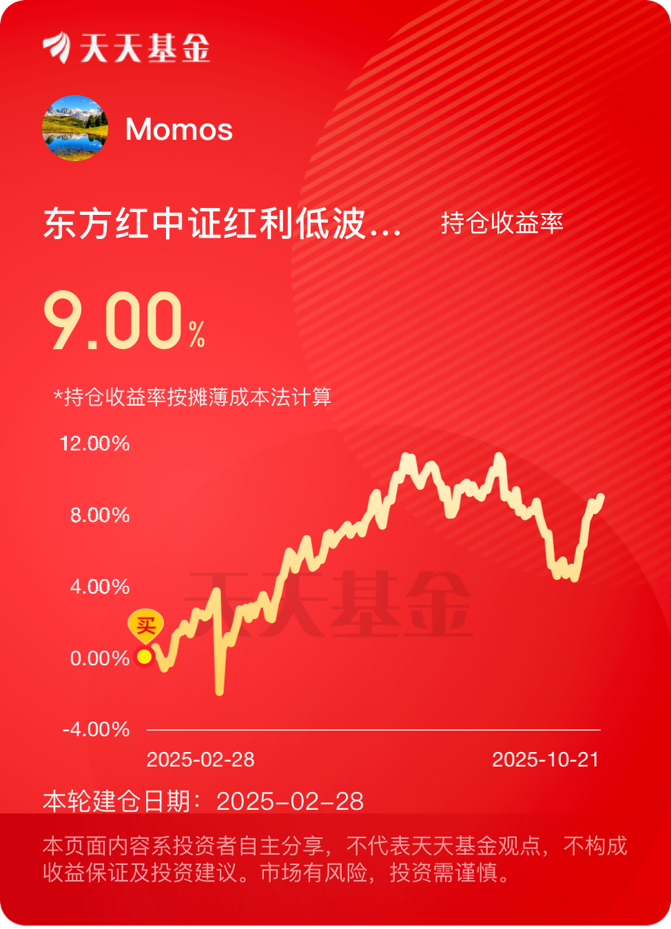 最近一直涨呢,红利整体看波动也不大,长期持有收益还是不错的 $东方红中证红利低波动指数C$ #晒收益#