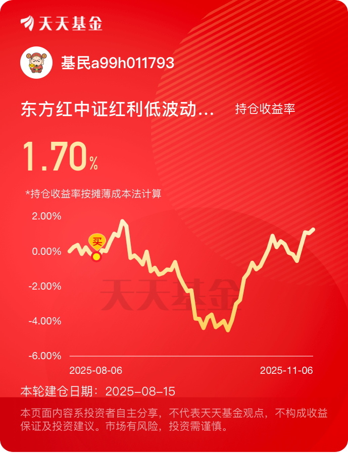 最近市场波动有点大,继续配置加红利板块,低波动+高股息,一个月也有6个点多收益,能涨抗跌稳健上涨还是很踏实的