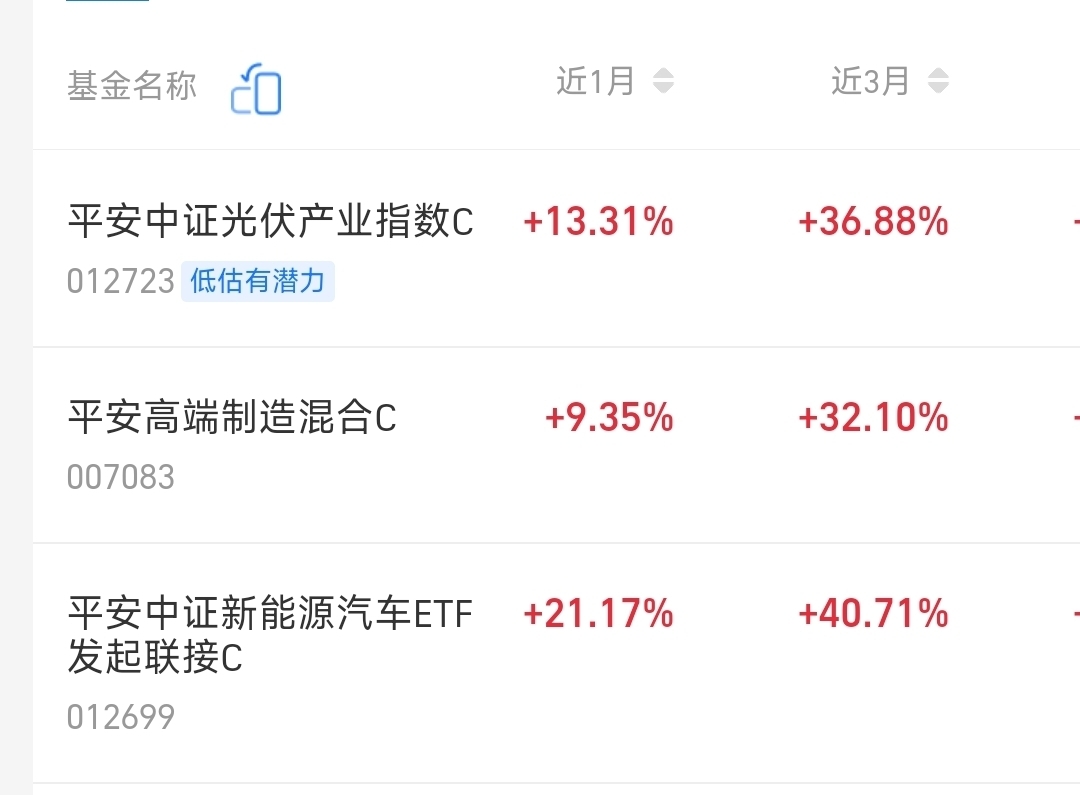 $平安中证新能车ETF联接C$ 近一月涨幅21.17%.三月涨幅40.71%.表现还是比较优秀