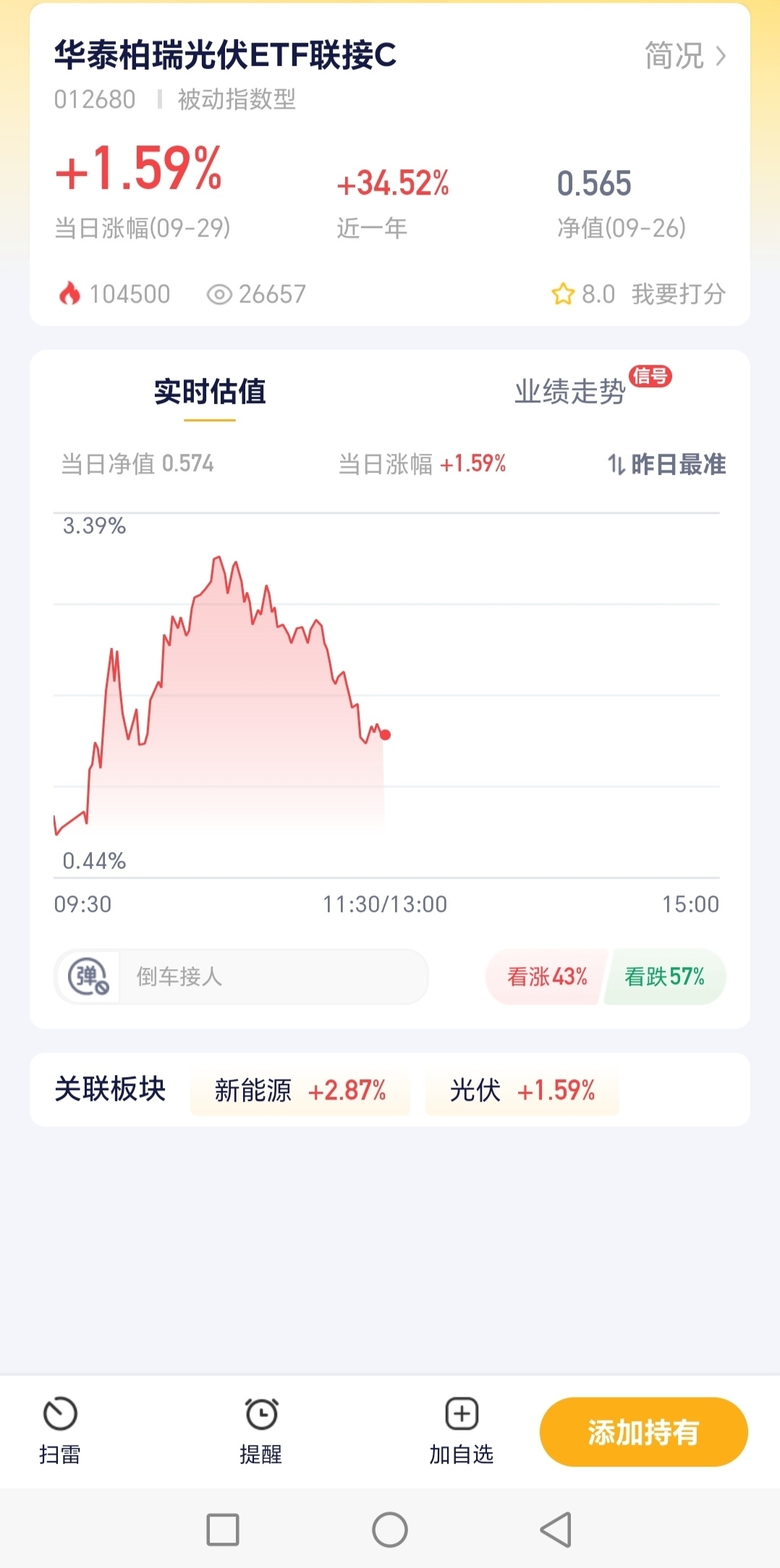 今天光伏板块涨得真猛,新能源涨了快3个点,光伏也跟涨了1.59%!上周钢铁、有色都开始反内卷,光伏作为第一个受益的板块,后续只会更强。华泰柏瑞近一年涨了34.52%,实力不俗。现在光伏的涨幅、估值、价格都有反转趋势,想布局光伏的朋友,华泰柏瑞是个不错的选择,它紧密跟踪光伏指数,让你轻松把握板块机会。