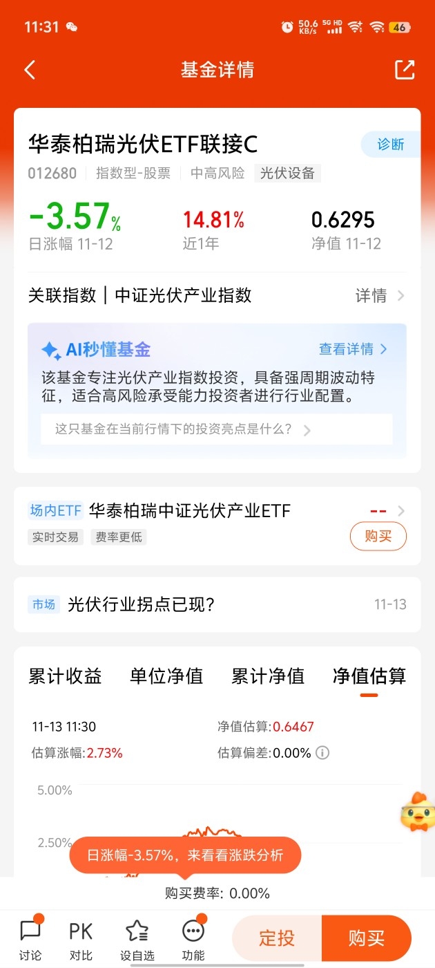 市场震荡的时候,真得找这种有基本面支撑的板块!今天光伏板块又逆势走强,龙头股带头拉升,这背后是“反内卷”政策的持续发力。之前行业里低价竞争太严重,大家都赚不到钱,现在不一样了,政策出手规范,企业也主动减产控价,价格稳住了,盈利自然就有盼头了。而且技术上也有突破,N型电池都成主流了,海外市场还特别认咱们的产品,订单排得满满的。这种时候布局光伏,时机刚刚好。华泰柏瑞的相关产品能紧跟行业趋势,覆盖的都是技术领先、抗风险能力强的龙头企业,不用天天盯盘,长期拿着跟着行业成长,比在其他板块瞎折腾靠谱多了。#11月基金投资策略# $华泰柏瑞光伏ETF联接C$