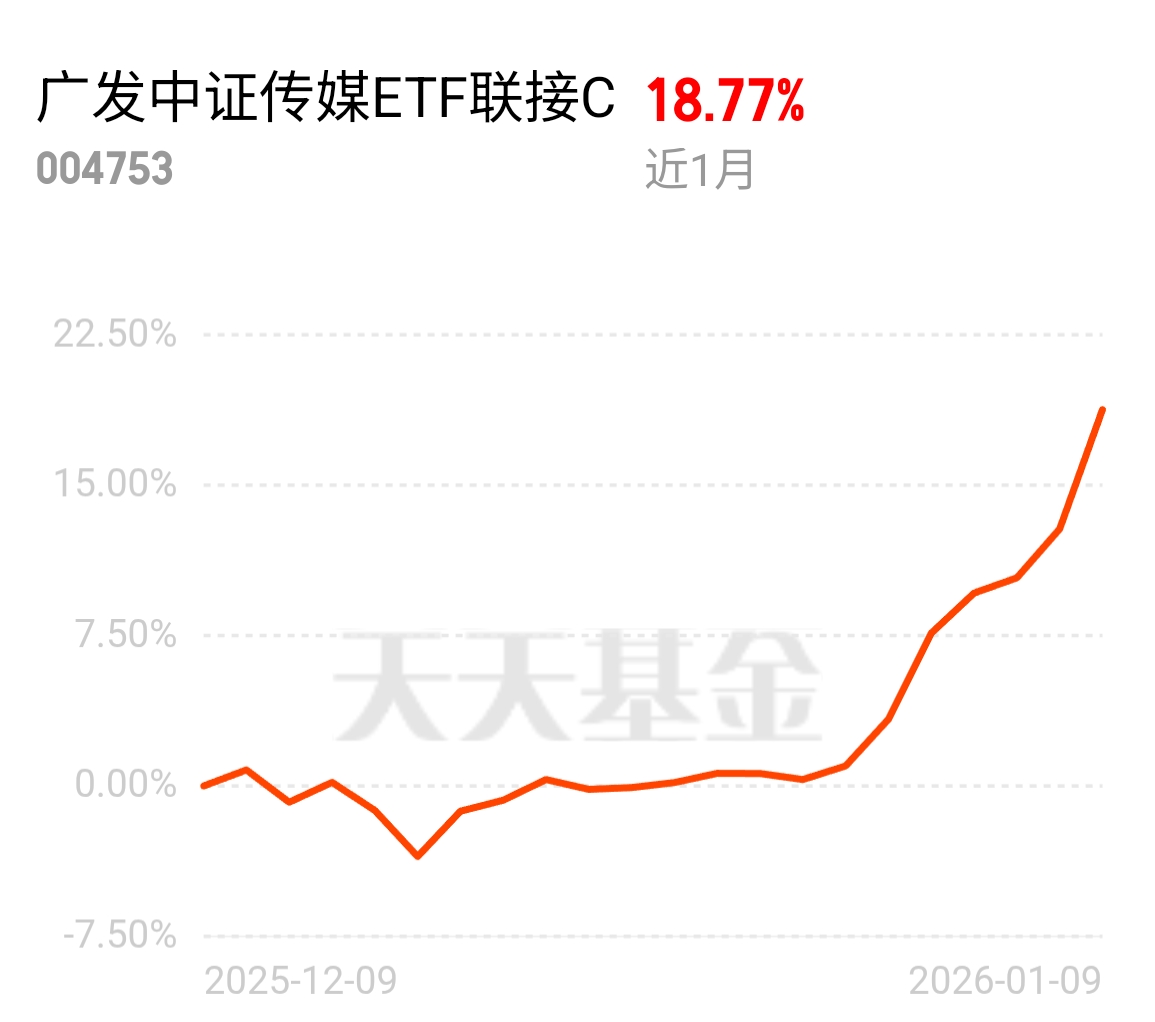 最近AI应用这波行情真的猛,传媒板块连涨8天不说,今天场内ETF都涨停了!感觉2026真要成AI应用元年了。我看了下广发中证传媒ETF联接C,持仓里好多都是正宗的AI应用股,热度超高,趁着启动早点布局看看$广发中证传媒ETF联接C$ #2025超额关键词# #GEO概念连续走强 AI应用领涨市场# #港股大模型概念狂飙 A股AIGC和算力股活跃#